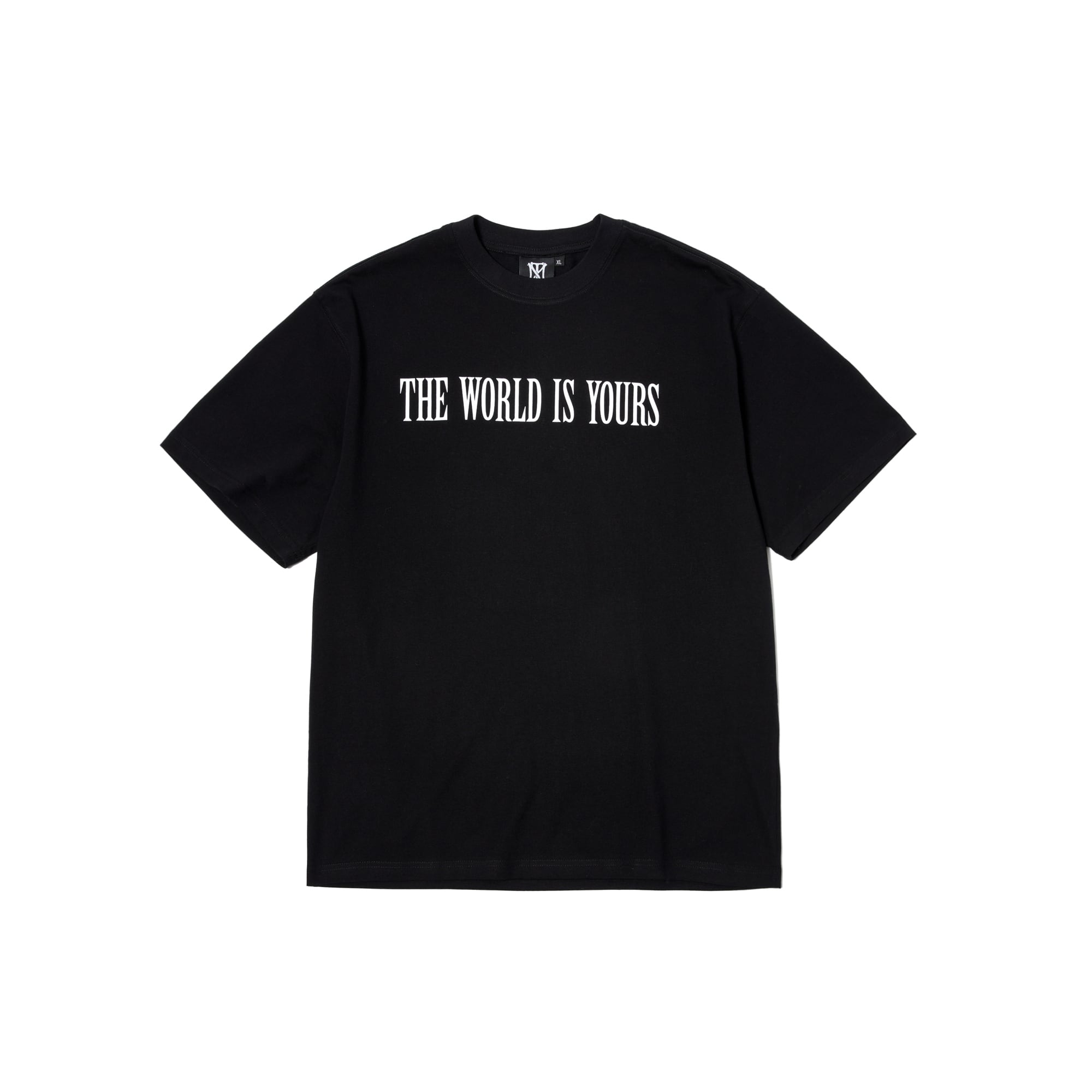 "THE WORLD IS YOURS" ロゴをフロントに大きくプリントした T シャツ。